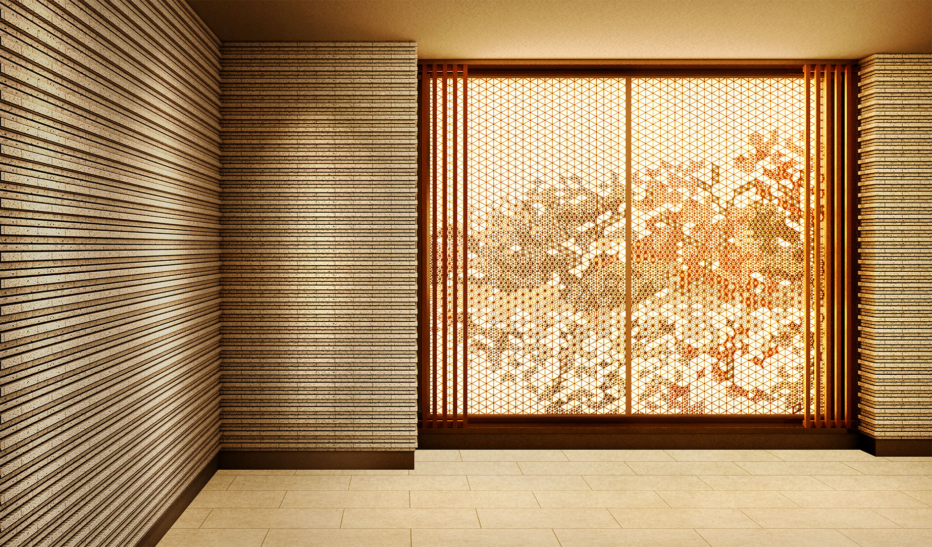 エントランスホールの壁には、六義園の水面に映る桜の風情をモチーフに、