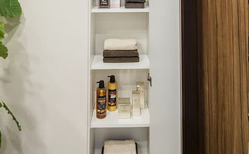 タオル類やサニタリー用品等を整理できる便利なリネン庫は、パウダールームをすっきりと演出します。